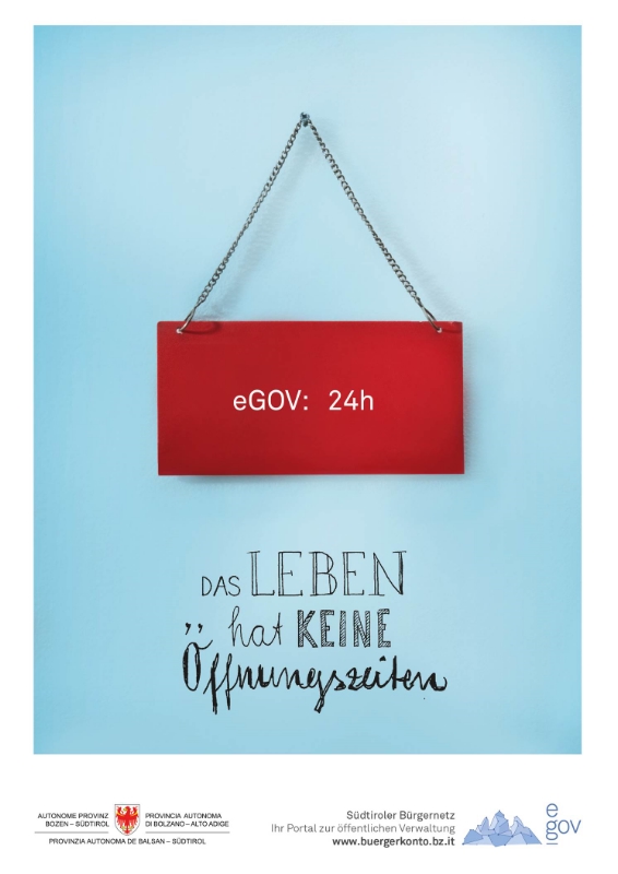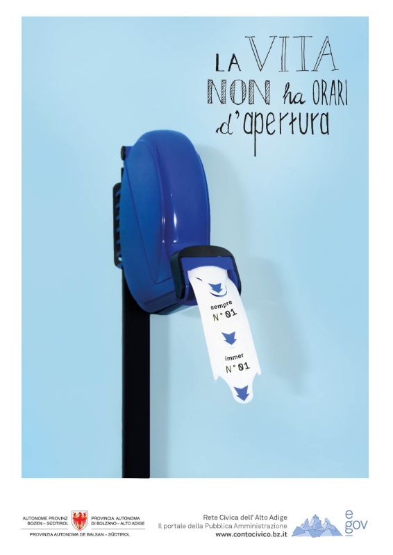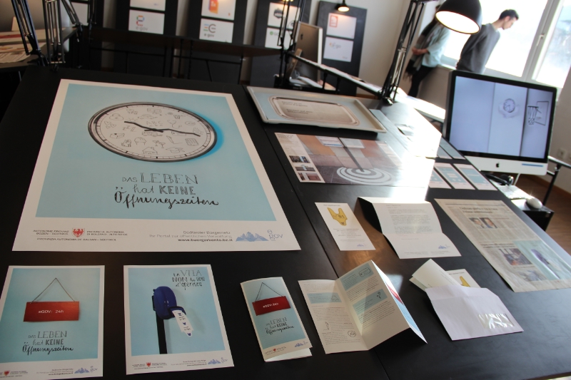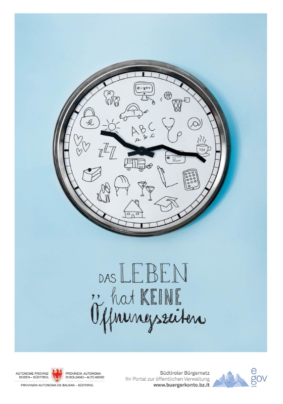 "Das Leben hat keine Öffnungszeiten - La vita non ha orari d'apertura", „Nutze die Zeit - Dai valore al tuo tempo": Mit diesen und ähnlichen Slogans könnten die elektronischen Behördendienste des Landes beworben werden, finden die Studierenden der Fakultät für Design und Künste der Uni Bozen. Und sie liefern auch schon Vorschläge für Logos, Plakate, Werbespots und Videos dazu.