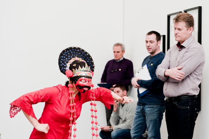 Einen aktiven Einstieg in den Museumstag bot die Gruppe F8 aus Wien (eine Gruppe junger Pädagoginnen und Performance-Künstlerinnen) mit der interaktiven Performance „Las Gaffas!", die alle Tagungsteilnehmer involvierte. Durch Perspektivenwechsel, mal kopfüber oder liegend, mit Tänzen, Wahrnehmungs- und Beobachtungsaufgaben, gaben sie ein motivierendes Beispiel zeitgemäßer Vermittlungsarbeit, basierend auf dem „anthropologischen Zirkeltraining", das wissenschaftliche Methoden und Kunst verbindet.