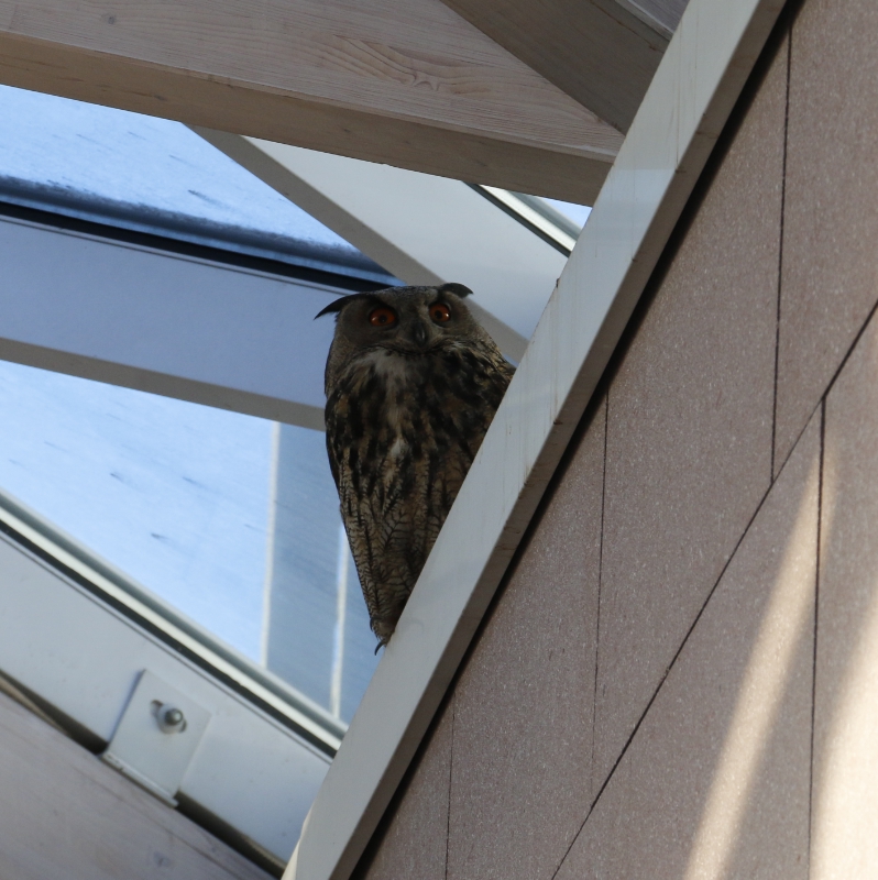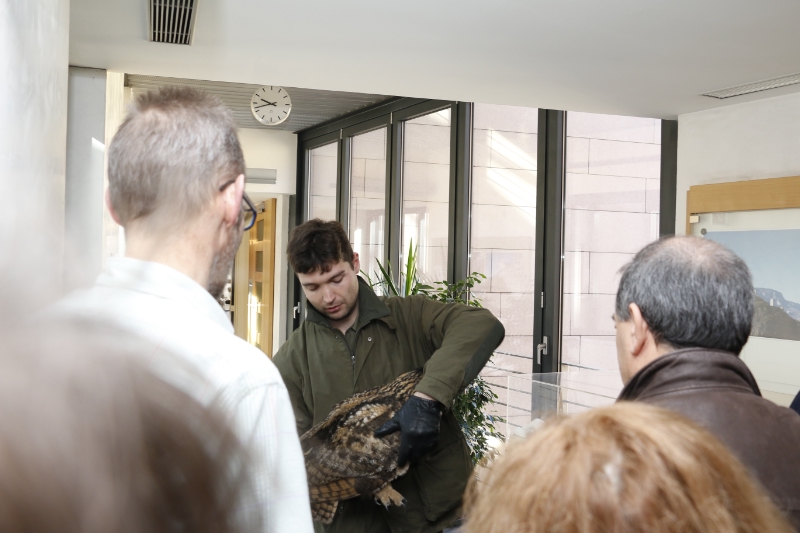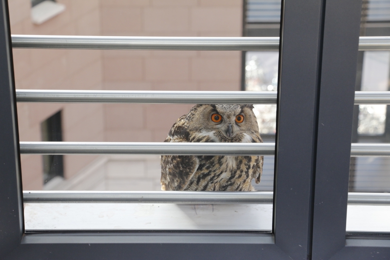 Beim Vogel handelt es sich um ein männliches Exemplar des Uhu (Bubo bubo), eine Vogelart aus der Gattung der Eulen. Am heutigen Dienstag, in den frühen Morgenstunden, wurde der Vogel von einigen Angestellten des Landhauses zwei in Bozen entdeckt. Das scheue Tier saß auf einem Gesims in den oberen Etagen des Innehofes und konnte sich wegen des geschlossenen Glasdaches nicht mehr aus seinem nächtlichen Quartier befreien. Der etwas verschreckte Uhu wurde nach kurzer Zeit von den freiwilligen Mitarbeitern des Bozner Vogelpflegezentrums "Avifauna" durch ein geöffnetes Fenster eingefangen und gerettet. "Der Uhu scheint ein bisschen verängstigt zu sein, aber ist ansonsten in Ordnung", erklärte der freiwillige Helfer Francesco Viglia nach der geglückten Bergung. "Er wird jetzt von einem Tierarzt untersucht und gepflegt, dann ein bisschen Rast genießen, bis wir in schließlich wieder frei lassen werden", so Viglia. Überraschend ist der Besuch der Eule für Viglia nicht: "Die Eulen halten sich gern in der Innenstadt und in der näheren Umgebung von Bozen auf, da für sie diese Umgebung in der Nacht zum Jagdrevier wird."