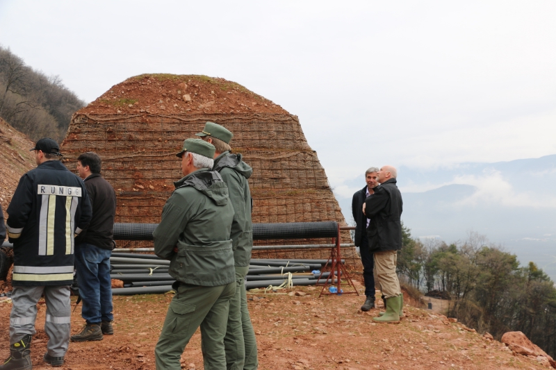 Wie Amtsdirektor Martin Schöpf vom Forstinspektorat Bozen 1 darlegte, wurde nach dem Schadensereignis in Zusammenarbeit mit den Landesgeologen der Zustand des Geländes mittels Laserscanning erhoben. Die Notwendigkeit einer massiven Verbauung im oberen Bereich stand schnell fest, mit den Gemeinden und dem Zivilschutz wurde ein Projekt erstellt: Eine große Wand wurde bereits gebaut und hat sich auch bereits bewährt, wie die dahinter liegenden Steine zeigen. Der zweite Damm wird nach Ostern fertig gestellt. Die Maße sind beeindruckend: So misst eine Wand über fünf Meter an der Innenseite und acht bis zehn Meter an der Unterseite. Zum Bau wurde das vor Ort vorhandene Material genommen. Die Schutzwände bestehen aus bewehrter (armierter) Erde, einem Verbundkörper aus Boden und einer Bewehrung, zu der Geotextilien verwendet werden.