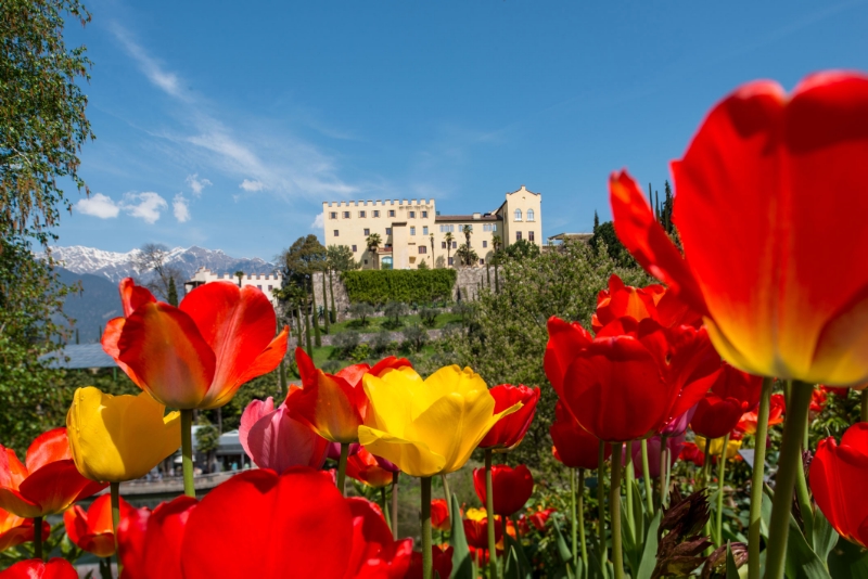 Über 200.000 Tulpen verschiedenster Arten und Sorten, Farben und Formen, hunderttausende Narzissen, Hyazinthen, Krokusse, Begonien und weitere Frühjahrsblüher eröffnen am Mitwoch, dem 1. April, die neue Gartensaison. Bunte Blütenteppiche rahmen das sieben Kilometer lange Wegenetz durch die zwölf Hektar große Anlage der Gärten von Schloss Trauttmansdorff in Meran.