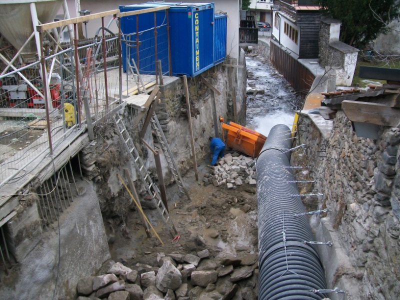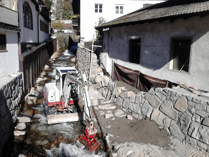 Es sei eine schwierige Baustelle gewesen, blickt Amtsdirektor Alexander Pramstraller zurück. Nach dem Neubau des Kraftwerkes Gossensaß vor etwa drei Jahren am Eisack mit der neuen Wasserfassung oberhalb von Pontigl wurden die gesamten Wasserableitungen der etlichen Kraftwerke im Eisack entfernt. Dadurch erschloss sich dem Landesamt für Wildbach- und Lawinenverbauung Nord die Möglichkeit, das Bachbett im Ortsbereich von Gossensaß für ein Jahrhunderthochwasser auszurichten. Im Zuge der Arbeiten wurden die bestehenden Bachsperren entfernt, die Ufermauer wurde abgerissen und neu errichtet, das Gefälle ausgeglichen. Eine besondere Herausforderung stellte die Baustelle im sehr beengten Bereich unterhalb vom Hotel Nußbaumer dar: Hier musste ein Turmdrehkran mit einer Tragkraft von zehn Tonnen montiert werden, um die schweren Baumaschinen je nach Bedarf verstellen und das Aushubmaterial entnehmen zu können.