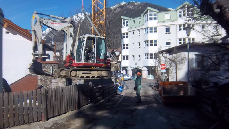 Um die Aushübe vornehmen zu können, erklärt Projekant und Bauleiter Paul von Hepperger, musste zuerst die Baustelle mit Hilfe von drei bis sechs Meter langen Ankern und Spritzbeton gesichert werden. Aus Sicherheitsgründen wurden die angrenzenden Häuser unterfangen. Da in den Wintermonaten im Eisack weniger Wasser fließt und dieses mit Hilfe von Rohren abgeleitet werden konnte, wurde diese Zeit als Bauzeit genutzt. Im Einsatz waren Vorarbeiter Otto Gruber und sein Bautrupp.