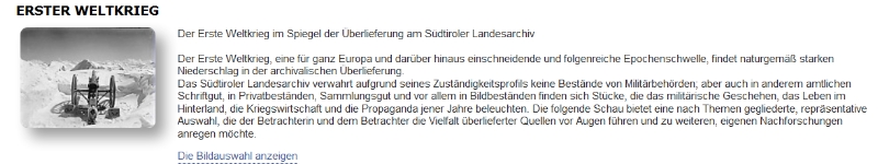 "Der Erste Weltkrieg im Spiegel der Überlieferung" unter diesem Titel hat das Südtiroler Landesarchiv eine neue Online-Schau zusammengestellt. Landeshauptmann Arno Kompatscher und Landesrat Florian Mussner werden die über 160 Bilder umfassende eAusstellung im Rahmen einer Pressekonferenz am Donnerstag, 21. Mai, freischalten.