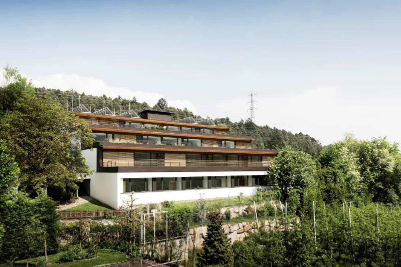 Am 8000 Kubikmeter großen Heimtrakt mit Zimmern und Klassenräumen auf vier terrassierten, den Geländeverlauf folgenden Geschossen der Fachschule für Hauswirtschaft und Ernährung Frankenberg in Tisens wurden in den vergangenen Monaten verschiedene Arbeiten zur energetischen Sanierung durchgeführt. Das Gebäude wurde unter Regie des Amts für Hochbau West der Landesabteilung Hochbau und technischer Dienst an den Standard des „Nearly Zero Energy Building" der Europäischen Gebäuderichtlinie angepasst. Damit erreicht das Gebäude die Zertifizierung als KlimaHaus A.