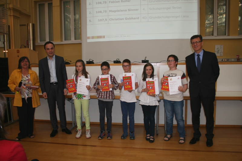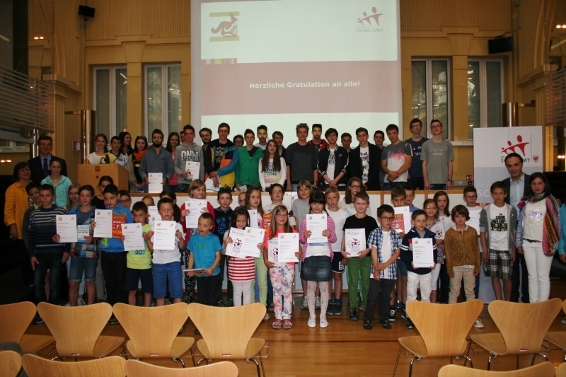 Die jeweils fünf Bestplatzierten der insgesamt 13 Kategorien wurden durch Bildungslandesrat Achammer und Schulamtsleiter Höllrigl mit einem Diplom und einem Buchpreis ausgezeichnet. Unter den Prämierten sind einige Schüler, die bereits in den vergangenen Jahren durch besondere Leistungen in Mathematik aufgefallen und bereits im Rahmen des "Kängurus" prämiert worden sind. Auch in diesem Jahr waren die Buben stärker vertreten als die Mädchen, besonders in der Oberstufe.