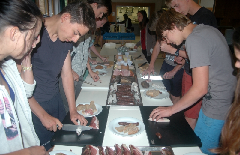 Nach dem Vortrag fanden sich alle Schüler und einige Lehrer der Laimburg zu einer typischen Südtiroler Bauernmarende in der Mensa ein. Käse, Speck, Brot, eingelegtes Gemüse und vieles mehr - alles regionale Produkte von ausgewählten Südtiroler Betrieben - wurden aufgetischt und verkostet. Die Initiative zeigte die Schönheit und den Wert der regionalen Produkte auf und machte Lust auf mehr.