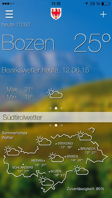 Im Google Playstore wie auch im Apple App Store wird die Wetter App hervorragend bewertet. Ab sofort können mehrere Gemeinden auf dem Startbildschirm ausgewählt werden, außerdem wurden die Widgets rundum erneuert und können nun auch von Apple-Usern genutzt werden. Die App ermöglicht den Zugriff auf alle 80 Südtiroler Wetterstationen, die nicht nur auf einer Geländekarte, sondern nun auch in tabellarischer Form dargestellt werden.