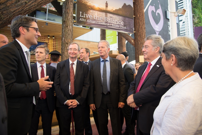 Beim heutigen (26. Juni) Österreich-Tag auf der Expo 2015 in Mailand stand auch der Südtirol-Stand im Fokus. Landeshauptmann Arno Kompatscher konnte eine hochrangige, von Bundespräsident Heinz Fischer angeführte Delegation empfangen und unterstrich dabei die Brückenfunktion Südtirols zwischen Nord und Süd.