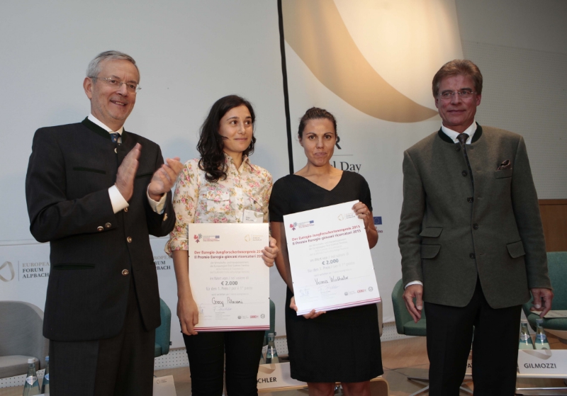 Anschließend wurde der von den Wirtschaftskammern der Europaregion mit je 2000 Euro dotierte Euregio-Jungforscher-Preis verliehen: Heuer erhielten mit Verena Wisthaler (Europäische Akademie Bozen) und Gracy Pelacani (Universität Trient) punktegleich erstmals zwei JungforscherInnen die Auszeichnung. Die Südtirolerin Verena Wisthaler präsentierte eine vergleichende Studie, wie der Heimatbegriff in den Minderheitengebieten Südtirol, Korsika, Baskenland, Wales und Schottland von den politischen Parteien im Hinblick auf die Integration ausgelegt wird. Gracy Pelacani aus dem Trentino zeigte auf, wie die Erfahrungen aus dem Schutz der angestammten Minderheiten für eine erfolgreiche Integrationspolitik genutzt werden können.