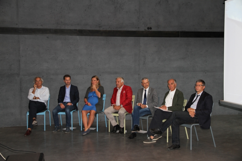 v.l..n.r.: Roland Griessmair (Bürgermeister von Bruneck), Gerhard Mahlknecht (Architektbüro EM2-Studio EM2, ), Elisa Taddei (Studio Architettura Park Associati, Planerin des Salewa-Firmensitzes in Bozen ), Heiner Oberrauch (Präsident der Gruppe Salewa-Oberalp), Wolfgang Thaler (Präsident der Architektenkammer Bozen), Bruno Gabbiani (Präsident der Organisation ALA-Assoarchitetti ) und Andrea Sega (Direktor der Landesabteilung Hochbau)