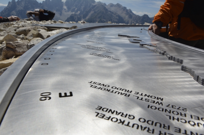 Bergführer Erwin Steiner erklärte abschließend das großartige Gipfelpanorama, das sich von der "Welterbeterrasse Strudelkopf" aus öffnet. Zu sehen sind unter anderem die Pragser Dolomiten, das Cadini- und das Cristallo-Massiv und die Sextner Dolomiten.