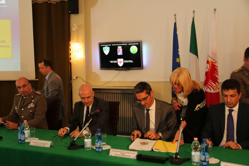 Landeshauptmann Arno Kompatscher hat heute Vormittag im Offizierskasino in Meran gemeinsam mit dem Staatssekretär im Verteidigungsministerium, Gioacchino Alfano, und dem Direktor der Agentur für Staatsgüter, Roberto Reggi, ein ergänzendes Abkommen zur Tauschvereinbarung Militär-Land und zur Übergabe der Kaserne "Mercanti" in Eppan unterzeichnet.