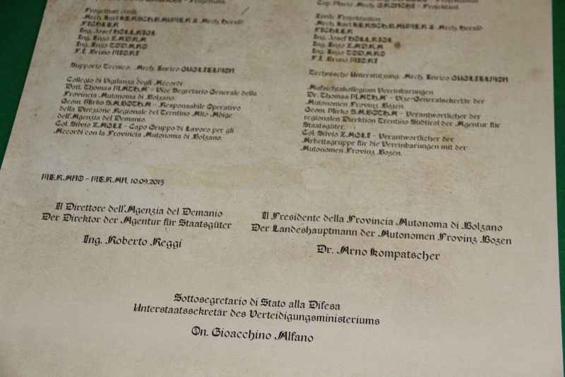 Nach der Vertragsunterzeichnung wurde auf dem Gelände der "Battisti"-Kaserne in Meran der Grundstein für drei Wohnhäuser für Berufssoldaten mit Familien gelegt, die das Land für das Militär nach aktuellen Umwelt- und Sicherheitsstandards errichtet Die Landesvergabeagentur wird den Bauauftrag in Kürze vergeben. An der Ausschreibung haben sich fünf Unternehmen, davon vier Südtiroler Firmen, beteiligt. Mit der Besichtigung eines vom Land auf dem Gelände der "Polonio"-Kaserne errichteten Wohngebäudes für Berufssoldaten wurde der Festakt abgeschlossen. Neben Staatssekretär Alfano, Direktor Reggi, Landeshauptmann Kompatscher und seinem italienischen Stellvertreter Christian Tommasini nahmen Regierungskommissärin Elisabetta Margiacchi, Führungskräfte der Militärbehörde, der Landesverwaltung und der Gemeinde Meran mit an der Spitze Bürgermeister Paul Rösch teil.