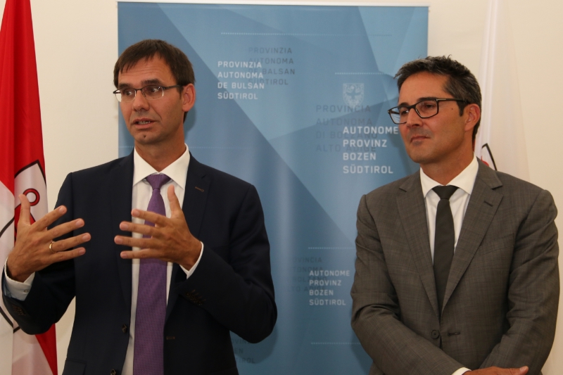 Die gute Zusammenarbeit unterstrich auch Landeshauptmann Arno Kompatscher: "Die spezifische Interessenlage im Alpenraum erfordert ein koordiniertes Vorgehen, um gute Perspektiven und neue Chancen für die Weiterentwicklung zu erschließen." Grundlage dafür solle die Makroregion Alpen bilden. Mit Beschluss der EU-Kommission Ende Juli, wurden hierfür die Weichen gestellt. Geben die europäischen Regierungschefs im Dezember grünes Licht, wäre der Alpenraum nach dem Ostseeraum, der Donauraumregion und der Region Adria-Ionisches Meer die bereits vierte Modellregion in Europa mit einer eigens abgestimmten, makroregionalen EU-Strategie. Beide Landeshauptleute sind sich einig über die Marschrichtung in Europa: "Die Makroregion wäre die ideale Plattform, in der alle Regionen des Alpenbogens auf Augenhöhe mit der Europäischen Union und mit den Mitgliedsstaaten gemeinsame Antworten für die spezifischen Anforderungen des Lebensraums formulieren können", betonte Landeshauptmann Kompatscher. Mit dem Instrument können sich die Regionen ein neues Sprachrohr gegenüber der EU schaffen, so Kompatscher weiter. Landeshauptmann Wallner ging auf die zusätzlichen Potentiale ein, die sich entfalten ließen: "Gerade in den Bereichen Wirtschaft, Innovation, Bildung, Energie, Klimaschutz, Verkehr und Tourismus ist für die Alpenregionen noch sehr viel möglich, wenn noch stärker zusammengearbeitet wird."