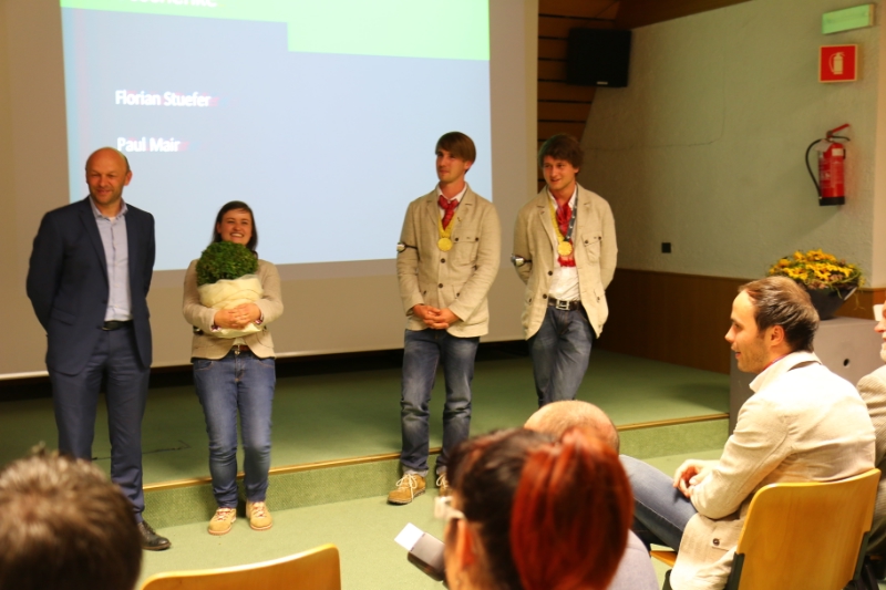 Stefanie, Matthias und David - die drei Weltmeister - berichteten schließlich kurz über ihre monatelange Vorbereitung, die vom LVH organisiert worden war, sowie über ihre Eindrücke, Erlebnisse und Erfahrungen in Brasilien. "Mit Freude kann man alles erreichen", gaben sie den anwesenden Schülerinnen und Schülern der Fachschule Laimburg als Tipp mit auf den Weg.