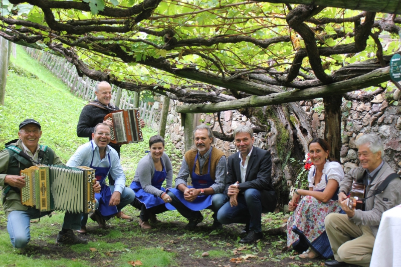 Beim Wimmfest dabei waren auch Vertreter und Vertreterinnen des Tourismusverein Tisens, von Castel Katzenzungen und der Gärten von Schloss Trauttmansdorff, die 2006 die Patenschaft für diese einzigartige Rebe übernommen haben. Seitdem wird aus den Versoaln-Trauben im Landesweingut Laimburg, das die Rebe und ihren Weinberg pflegt, der kostbare Versoaln-Wein gekeltert.