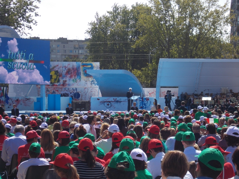 Um 11 Uhr begann die Feier, die von Fabrizio Frizzi moderiert wurde, mit dem "Inno di Mameli". Es folgte ein abwechslungsreiches Programm: Musik vom sizilianischen "cantautore" Lorenzo Fragola, Beiträge einzelner Schulen der südlichen und nördlichen Regionen Italiens, wie zum Beispiel ein Ballett, ein Rap und die typische Tarantella aus Apulien. Sehr eindrucksvoll waren die Reden der Bildungsministerin Stefania Giannini und des Staatspräsidenten Sergio Mattarella. Sie unterstrichen die wichtige Rolle der Schulen, den jungen Generationen Antworten auf die großen Probleme der heutigen Zeit zu geben. Diese Antworten lauten: Bildung und Vertrauen. Sie sind die wichtigsten Werte, die die Schule vermitteln soll.