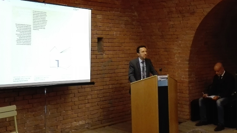 Zum Auftakt der Ausstellung fand heute auch eine Gesprächsrunde statt. Nach den Grußworten der beiden Landesräte sowie des langjährigen Landesbaudirektors und Vorsitzenden des wissenschaftlichen Beirates der Franzensfeste, Josef March, konnten die Ausstellungskuratoren mit Fachleuten aus dem Bauwesen und der Architektur sowie der Pädagogik und Didaktik über die Schularchitektur in Südtirol diskutieren. Unter den eingeladenen Experten war auch Laura Galimberti, die im Präsidium des Ministerrates in Rom für die Koordinierung und Förderung der Arbeiten im Schulbau zuständig ist.