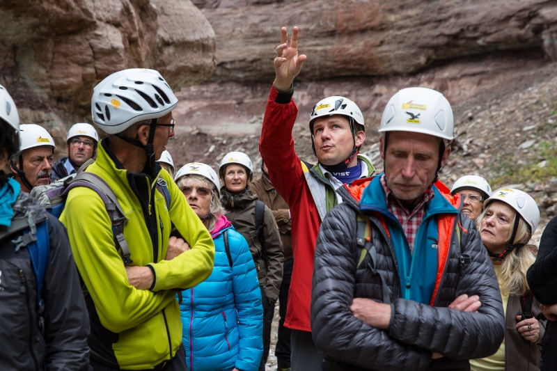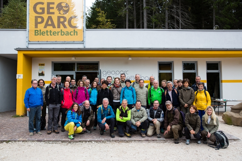 Eine Reise durch die Jahrmillionen der Erdgeschichte konnten die Teilnehmer bei der Besichtigung des Geoparcs Bletterbach in Aldein und der anschließenden geologischen Exkursion in der Bletterbachschlucht unternehmen. Peter Daldos und Christian Weber, Präsident und Direktor des Geoparc Bletterbach, gingen auf die Entwicklung des Besucherzentrums, das dieses Jahr sein 10-jähriges Bestehen feiert, und auf die Besonderheiten in der geologischen Struktur der Schlucht ein, die als weltweit einzigartig gilt.