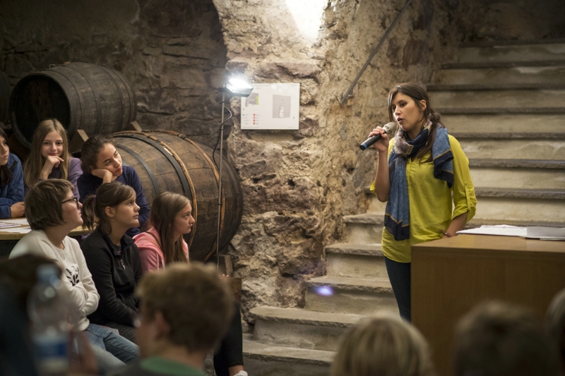 Zuerst besuchten sie das Museum und lernten dort Neues über die Welt des Weinbaus kennen. Dann arbeiteten sie zusammen mit Alissa Thaler, die selbst als junge Slammerin auf vielen Bühnen unterwegs ist, im Weinkeller. Hier begann dann der eigentliche Poetry Slam: Inspiriert von den Ausstellungsgegenständen und von der besonderen Kelleratmosphäre verfassten die Jugendlichen ihre Texte und trugen diese schließlich mit Mikrophon vor den Klassenkameraden vor.