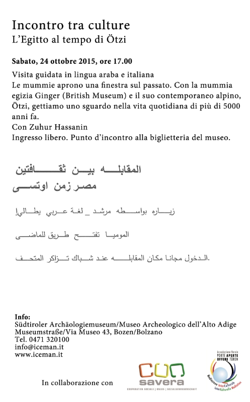 Die Veranstaltung findet in arabischer und in italienischer Sprache statt und soll zum gegenseitigen Verständnis verschiedener Kulturen und deren Geschichte beitragen. Die Teilnehmer werden von der Gastführerin Zuhur Hassanin und von Margit Tumler, Museumsvermittlerin am Südtiroler Archäologiemuseum, geführt. Der Eintritt in das Museum ist frei. Interessierte treffen sich am Ticketschalter.