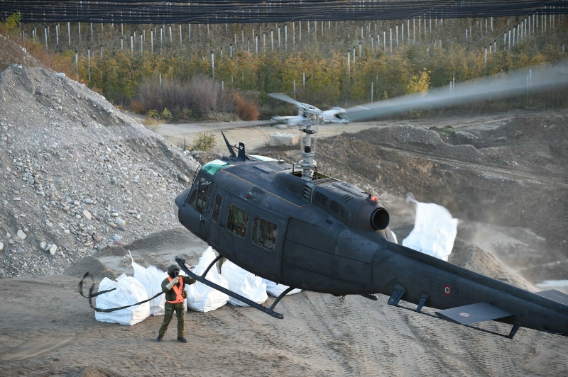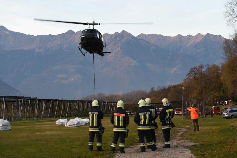 Um die Schadensstelle am Damm zu befestigen, füllt die Freiwillige Feuerwehr beim Schotterwerk Beton Lana in Lana Sandsäcke. Diese werden in sieben großen Nylonsäcken verstaut; jeder dieser Big Bags fasst an die 600 Kilogramm Sand. Da der Schadensort an der Falschauer schwer zugänglich ist, wird ein Hubschrauber angefordert, der auch über ein Nachtsichtgerät verfügen sollte.