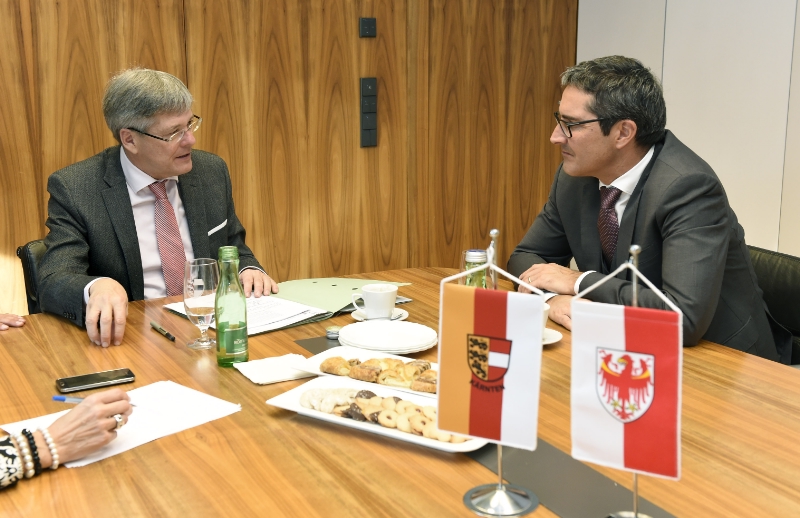 Zum ersten Mal seit seinem Amtsantritt hat Landeshauptmann Arno Kompatscher seinem Amtskollegen Peter Kaiser, der seit 2013 an der Spitze der Kärntner Landesregierung steht, einen Besuch abgestattet. "Es gibt zahlreiche Gemeinsamkeiten zwischen den beiden Ländern", so Landeshauptmann Kompatscher, "dabei denke ich nicht nur an die Volksgruppenfrage und die Grenzlage, sondern auch an die vergleichbare Bevölkerungszahl und die Bedeutung des Tourismus."