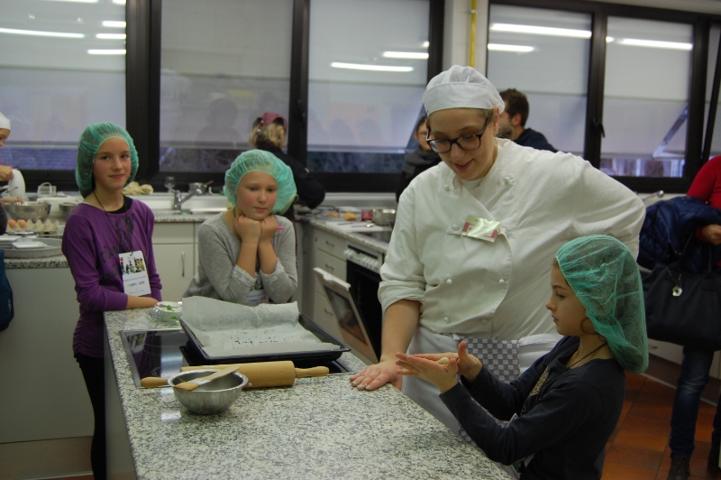 "Ich bin jetzt ein Koch", sagte der kleine Max, der gerade aus der Lehrküche kommt und in der Hand eine Waffel hält. Beim Workshop „Süße Waffeln" konnten die Kinder selbst Waffeln backen und nach Herzenslust mit Sahne, Zimtzucker oder Himbeerkonfitüre bestreichen. Beim Kräuter-ABC konnten die Familien ein Kräutersalz selbst mischen und mitnehmen.