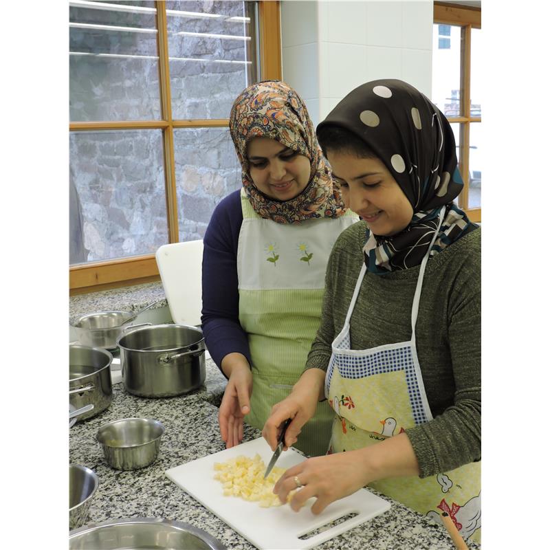 Die Frauen bemühten sich um das Erlernen hiesiger Kochtechniken und um das Kennenlernen von Speisen, die unsere betagten Mitbürger gewohnt sind. So wurden unter anderem Knödel gedreht, Rouladen gerollt, Fleisch gebraten, Gemüse gedämpft, Pizza gebacken, Spatzlen gehobelt und Unterlandler Polenta gerührt.