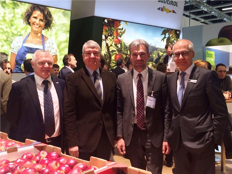 An die 2800 Aussteller mit über 65.000 Besuchern hat die 24. Auflage der "Fruit Logistica", die heute (5. Februar) in Berlin zu Ende geht. Sie bietet ein umfassendes Spektrum der Obst- und Gemüsebranche, vom frischen Obst und Gemüse über Produktverpackungen bis zu Anbautechnik und Sortenentwicklung. "Südtirol", berichtet Landesrat Arnold Schuler, "war von Anfang an bei dieser Fachmesse dabei, und die Strahlkraft Südtirols ist dank der Landwirtschaft im Allgemeinen und der Apfelwirtschaft im Besonderen enorm". Gestern (4. Februar) hat er die Fachmesse besucht, begleitet vom Direktor des Verbandes der Vinschgauer Produzenten für Obst und Gemüse Vi.P Josef Wielander, dem Obmann des Verbandes der Südtiroler Obstgenossenschaften VOG Georg Kössler und VOG-Direktor Gerhard Dichgans.