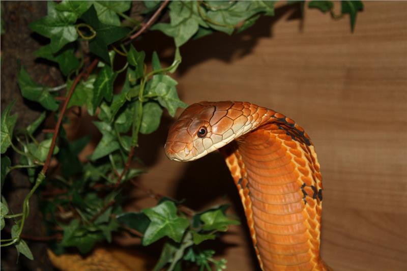 Zu sehen ist auch die Königskobra: Mit ihren bis zu fünfeinhalb Metern ist sie die längste Giftschlange der Welt, zudem eine der intelligentesten; eine Dosis ihres Giftes tötet bis zu 250.000 Mäusen oder 40 erwachsene Personen, unter Umständen auch einen Elefanten; diese aus Asien stammende Schlangenart ernährt sich ausschließlich von anderen Schlangen.