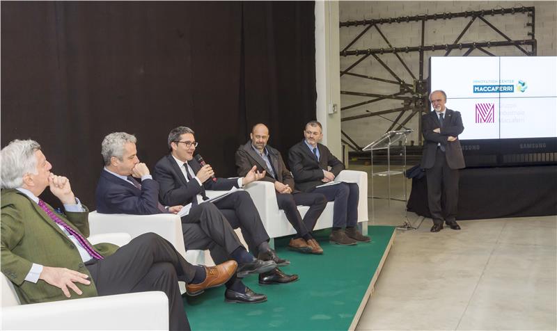 Die Teilnehmer der Podiumsdiskussion: V.L. Luigi Penzo, Vizepräsident der Gruppe Officine Maccaferri; Alessandro Maccaferri, Präsident der Gruppe Officine Maccaferri; Landeshauptmann Arno Kompatscher; Hansjörg Prast, Geschäftsführer IDM Südtirol; Stefano Cesco, Dekan der Fakultät für Naturwissenschaften und Technik, UNIBZ; Francesco Ferraiolo, Managing Director Maccaferri Innovation Center Francesco Ferraiolo, Managing Director Maccaferri Innovation Center