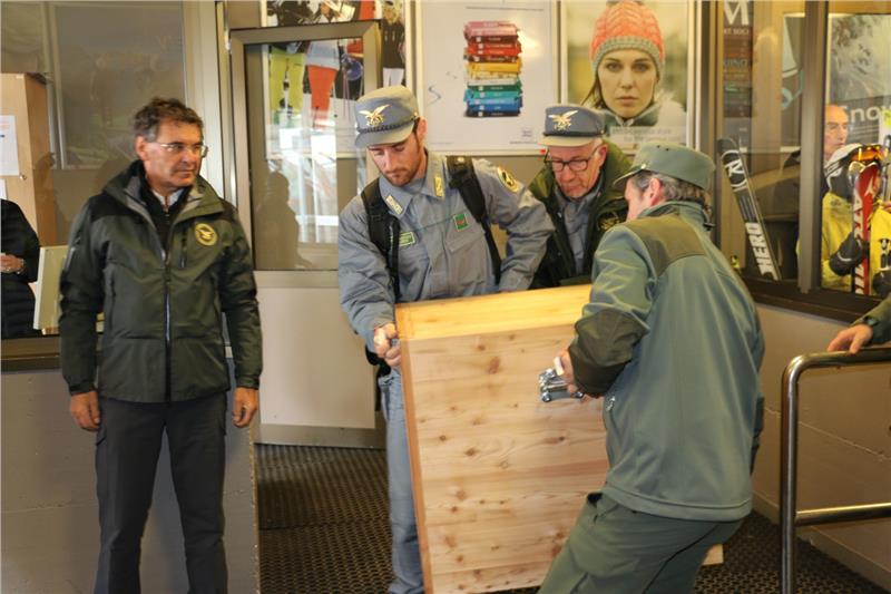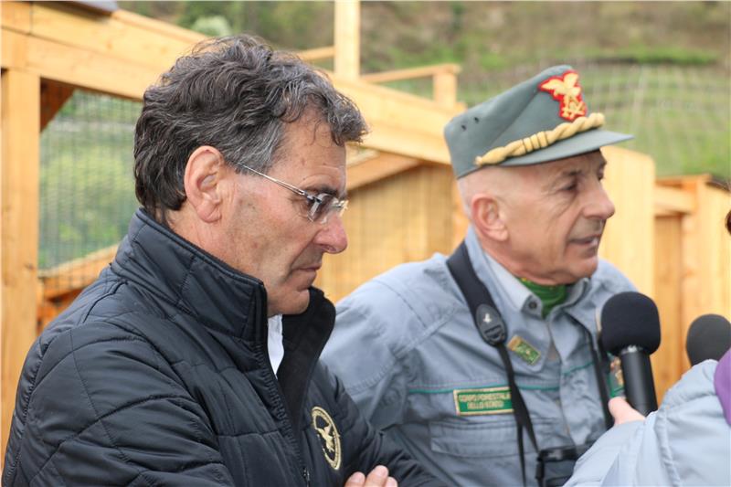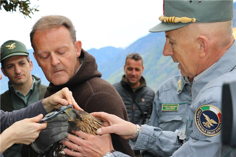 Der Corpo Forestale dello Stato (CFS, staatliches Forstkorps) untersteht dem Landwirtschaftsministerium und wird mit Ende dieses Jahres aufgelöst, von den rund 8000 Beamten wird der größte Teil zu den Carabinieri übertreten. Ihr Abzeichen ist seit 190 Jahren ein Adler. Um diesem baldigen "Abschied vom Adler" Ausdruck zu verleihen, haben heute Vertreter des nationalen Forstkorps aus Rom ein etwa drei- bis vierjähriges männliches Exemplar aus dem Pflegezentrum für Vogelfauna bei Schloss Tirol abgeholt; die Aktion wurde von Oberst Isidoro Furlan aus Verona geleitet.