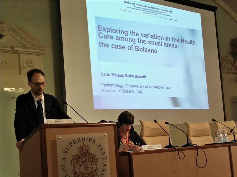 Anlässlich der internationalen Konferenz der Wennberg International Collaborative (WIC) "Reducing avoidable variation in Healthcare – A goal for regional strategies and actions", am 14. und 15. April 2016 in Pisa wurden die Koordinatorin der Epidemiologischen Beobachtungsstelle des Landes Südtirol Carla Melani und Mitarbeiter Mirko Bonetti eingeladen, einen Vortrag mit dem Titel "Exploring the Variation in the Health Care among the Small Areas: the Case of Bolzano" zu halten. Diese Konferenz wurde von der "Scuola Superiore Sant’ Anna" in Pisa im Rahmen des Netzwerkes zur Beurteilung der Performance der regionalen Gesundheitssysteme veranstaltet.