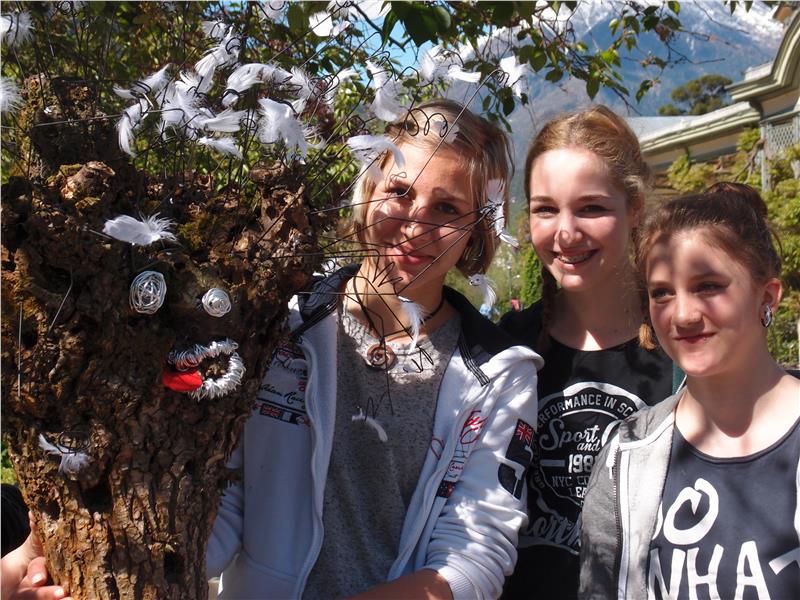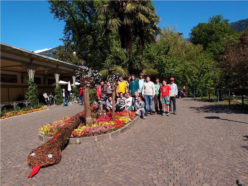 Mit Unterstützung ihrer Lehrpersonen und der Stadtgärtner konnten die Schüler das Werk mit dem Titel "Die Schlange und die Lobi" am Dienstag an der Winterpromenade in Meran aufbauen. Die Weidentriebe wurden zu einer 20 Meter langen Schlange gewunden, die von Phantasiewesen – den Lobis – begleitet wird.