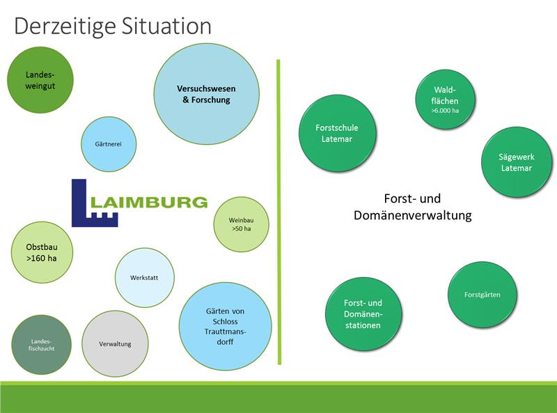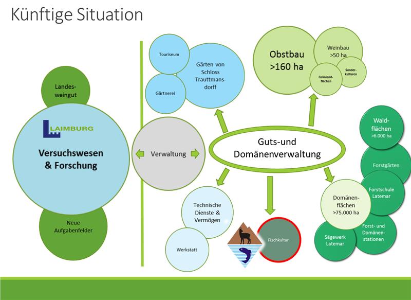 Das Versuchszentrum Laimburg wird sich auf Versuchswesen und Forschung konzentrieren und zudem neue Aufgabenfelder erhalten, etwa über den Aktionsplan Berglandwirtschaft; das Landesweingut bleibt als Forschungseinrichtung beim Versuchszentrum. Die Guts- und Domänenverwaltung gliedert sich in fünf Bereiche: technische Dienste und Vermögen, Gärten von Schloss Trauttmansdorff mit Gärtnerei, landwirtschaftlicher Bereich (Obstbau, Weinbau, Sonderkulturen, Grünlandflächen), Forstbereich (Domänenflächen, Waldflächen, Forstgärten, Forstschule Latemar, Sägewerk Latemar, Forst- und Domänenstationen); die bisherige Fischzucht bleibt als Immobilie Teil der Guts- und Domänenverwaltung, die operative Führung übernimmt das Amt für Jagd und Fischerei. Der fünfte Bereich ist die Verwaltung, die bei der Guts- und Domänenverwaltung angesiedelt ist, aber auch die Verwaltung des Versuchszentrums übernimmt. Außerdem: Der Felsenkeller der Laimburg, erklärte Landesrat Schuler, "soll zu einem Zentrum der Südtiroler Weinwirtschaft werden".