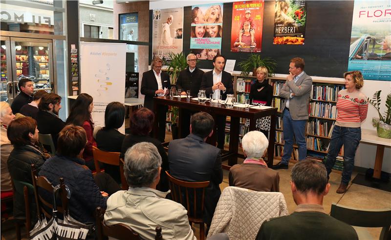 Landesrat Philipp Achammer, Ressortdirektorin Vera Nicolussi-Leck, Filmemacher Markus Frings, die Autorin der Integrationsfilme Christine Helfer, RAI-Koordinator Markus Perwanger und der Chefredakteur der ORF-Sendung "Südtirol heute" Siegfried Giuliani haben das Filmprojekt heute (27. April) im Filmclub in Bozen vorgestellt. Anwesend waren aber auch einige der insgesamt 30 Mitwirkenden.