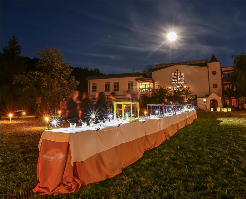 Auf der weitläufigen Wiese vor dem Schulgebäude verteilten sich die Schlosserlehrlinge und erzeugten mit ihren Flex zu den Rhythmen einer suggestiven Filmmusik einen wahren Funkenregen. Die begeisterten Gäste verzehrten gleich im Anschluss im Freien die erste festlich angerichtete Dessertkreation des Abends, einen luftigen Erdbeertraum.