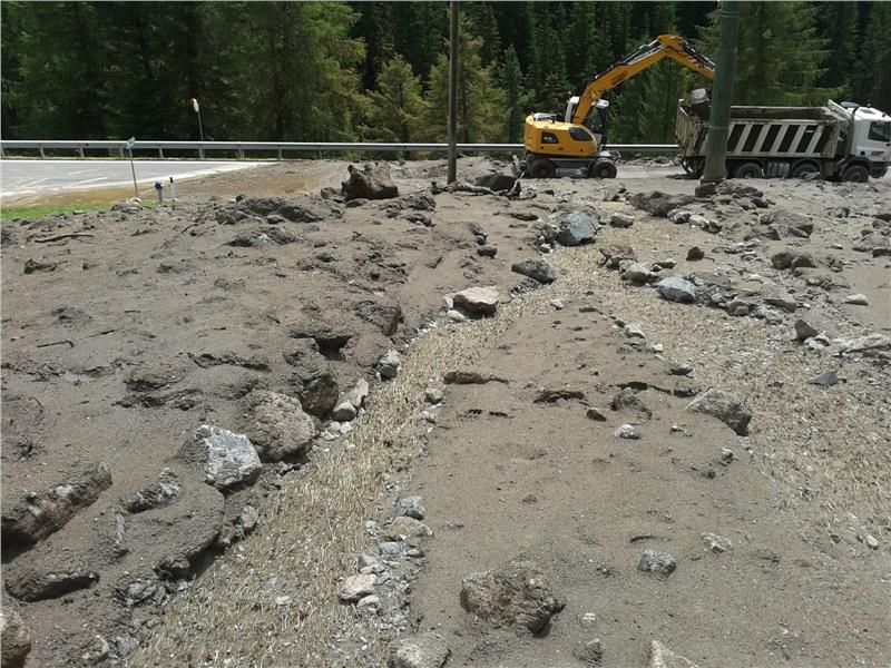 Der Pedrossbach, der zum Teil durch einen Rohrdurchlass verläuft, hat sich einen neuen Weg gesucht und damit die Landesstraße übermurt. Das Wasser hat eine solche Kraft entwickelt, dass sämtliche im Jahr 1903 erbaute Sperren zerstört worden sind. "Mittlerweile haben wir das Rohr entfernt und arbeiten an einem provisorischen Übergang. Mit Hilfe eines Baggers befreien wir das Bachbett vom Material. Falls eine Mure kommt, sollte der neu geschaffene Platz ausreichen", erklärt der Amtsdirektor, der weitere Maßnahmen ankündigt.