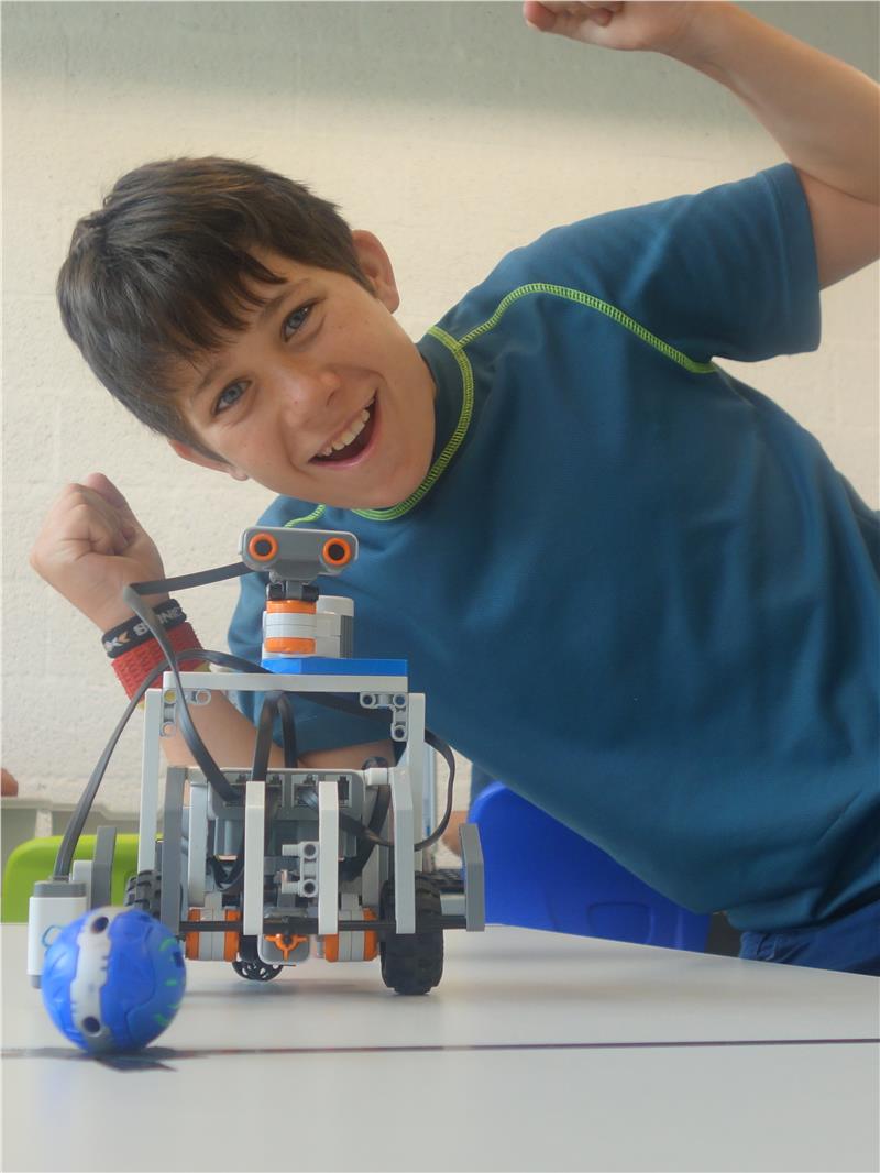 Der Kurs "Roboterbau" beschäftigt sich mit dem Bauen und Programmieren von Lego-Robotern. Die Fußball-EM in Frankreich war aber auch ein Thema. Eine Aufgabe dazu lautete, einen Roboter zu bauen, der den Ball am Elfmeterpunkt erkennt und einen Schuss auf das Tor abgibt. "Nach einer kleinen Pause mussten wir unseren Roboter dazu bringen, dass er einen Ball in ein Tor schießt. Wir mussten unseren Roboter auch mehrfach umbauen, bis das Resultat stimmte. Auch das Programmieren war ein bisschen nervenzehrend, aber es funktionierte!", kommentierte eine der Teilnehmerinnen die Aufgabenstellung.