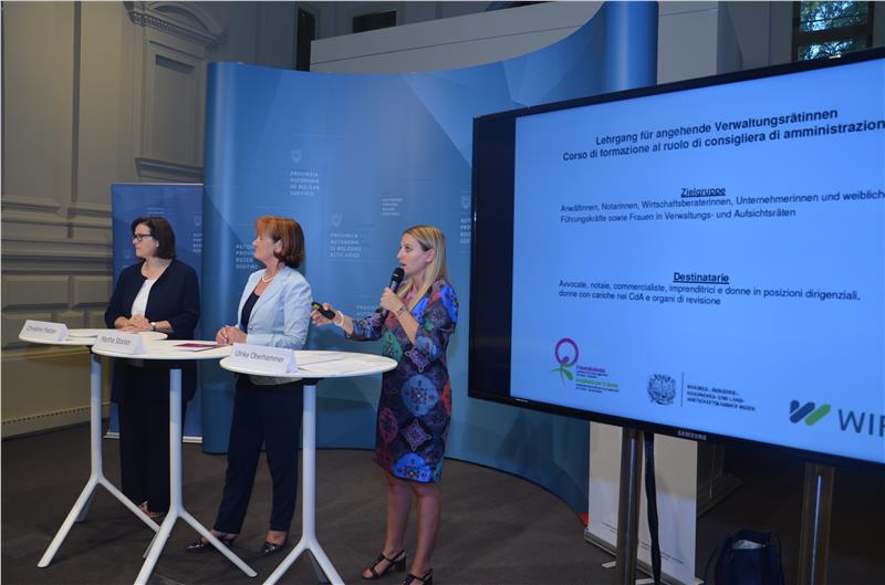 Im Rahmen der Frauenakademie des Landesbeirates für Chancengleichheit und in Zusammenarbeit mit dem WIFI sowie der Handelskammer Bozen startet in diesem Herbst der erste Lehrgang für angehende Verwaltungs- und Aufsichtsrätinnen in Gesellschaften mit öffentlicher Beteiligung. "Ziel ist es, Expertinnen besser aus- und fortzubilden sowie ein Netzwerk von Frauen in Verwaltungs- und Aufsichtsräten aufzubauen", unterstrich die Präsidentin des Landesbeirates für Chancengleichheit, Ulrike Oberhammer, bei der heutigen Vorstellung des Lehrgangs.