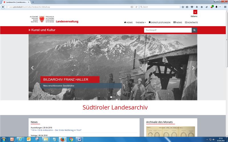http://www.provinz.bz.it/landesarchiv ist die Adresse der neuen Internetseite des Landesarchives, die kürzlich online geschalten wurde. Dank einer völlig neuen grafischen Gestaltung, einem übersichtlichen Seitenaufbau und einer starken GSA-Suchmaschine im Hintergrund sind alle Inhalte des Landesarchives nun leicht zugänglich und schnell abrufbar. Außerdem ist die Seite als responsive Webseite programmiert, das heißt sie wird auf allen Endgeräten (Laptops, Desktop-Computern, Tablets, Smartphones, E-Book-Readern und Fernsehgeräten) korrekt angezeigt.