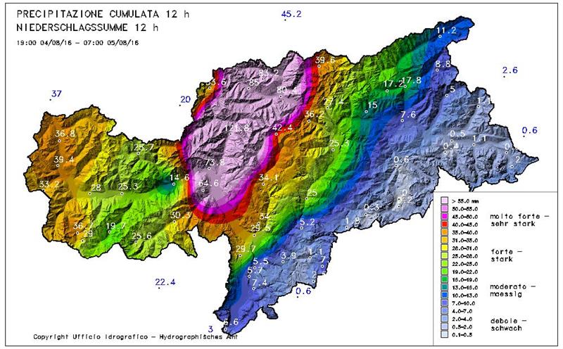 In den ersten Stunden ereigneten sich verteilt auf das gesamte Gebiet des Landes ausnehmend starke lokale Niederschlägen. Dies führte zu verschiedenen Schadenslagen und kurzfristigen Anhebungen der Fluss- und Bachpegel in den betroffenen Gebieten, meldet das Landeslagezentrum im Zivilschutzzentrum in der Drususallee in Bozen.