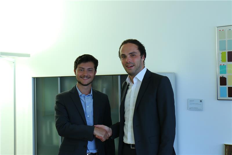 Landesrat Philipp Achammer (r.) und der scheidende Vorsitzende des Landesbeirates der Schülerinnen und Schüler, Julian Nikolaus Rensi (l.)