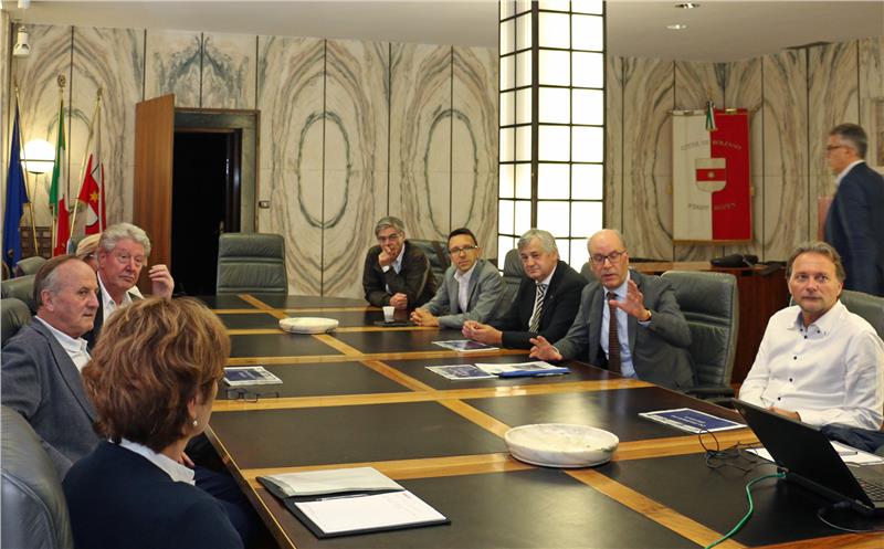 Der Koordinator der Arbeitsgruppe Pagani, LR Mussner und LR Tommasini sowie die Vertretern der Gemeinde bei der Sitzung zur Bozner Umfahrung (FOTO: Angelika Schrott - www.provinz.bz.it/news)