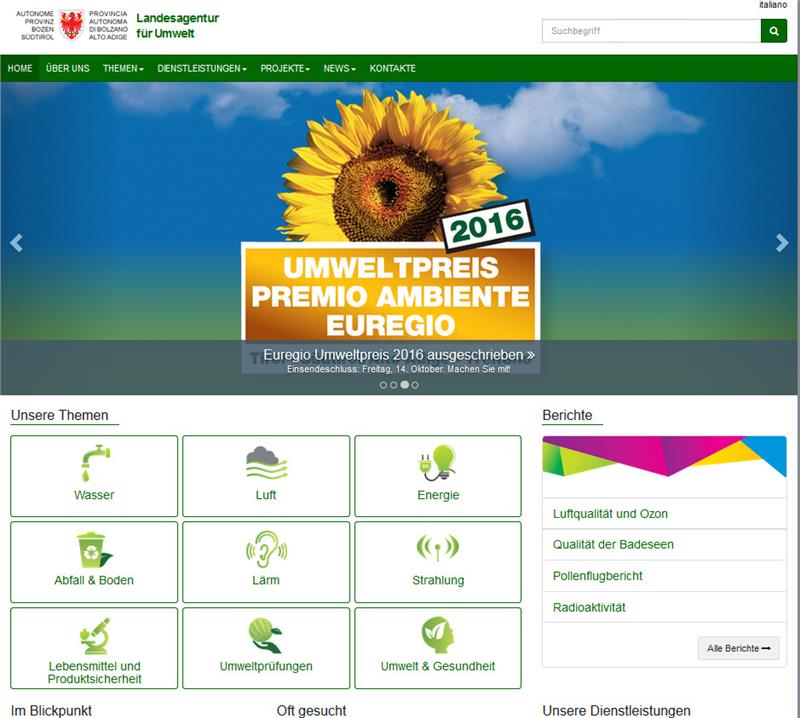 Überarbeitete und aktualisierte Inhalte, eine nutzerfreundliche Gestaltung und ein neues Layout: das zeichnet die das neue Umwelt-Portal des Landes aus. Unter "umwelt.provinz.bz.it" haben Nutzer Zugang zu Daten und Informationen aus neun verschiedenen Umweltbereichen: Wasser, Luft, Energie, Abfall und Boden, Lärm und Strahlung, Lebensmittel und Produktsicherheit, Umweltprüfungen sowie Umwelt und Gesundheit. Ein eigner Raum ist den Berichten vorbehalten. Dort kann Einblick in die aktuellen Luftmessdaten, die Badeseenqualität, die Radioaktivität, den Emissionsbericht der Müllverwertungsanlage und den Pollenflugbericht genommen werden. Wer neue Nachrichten aus dem Umweltbereich sucht, der findet sie ebenfalls gebündelt in einem Info-Bereich, und zwar mit Texten, Bildern und Videos.