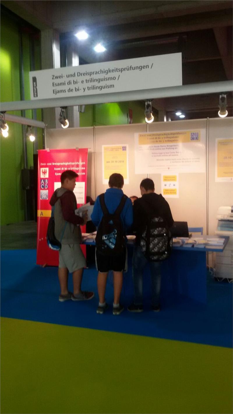 Die Dienststelle für die Zwei- und Dreisprachigkeitsprüfungen nimmt ebenfalls mit einem eigenen Stand an der Bildungsmesse Futurum teil, um Interessierten Auskunft über die Prüfungen zu geben, vor allem aber, um auf die Online-Anmeldung für die Prüfungen aufmerksam zu machen.