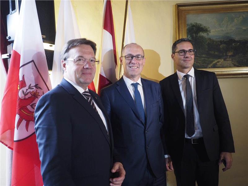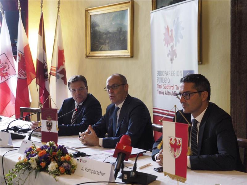 Der Vorstand des Europäischen Verbunds territorialer Zusammenarbeit EVTZ "Europaregion Tirol-Südtirol-Trentino" ist heute (19. Oktober) unter Trentiner Vorsitz in Castel Toblino in Sarche zu seiner 13. Sitzung zusammengekommen. Getagt hat heute auch die Versammlung des EVTZ, die zu ihrer zehnten Sitzung zusammengekommen ist. Die Führungsgremien der Europaregion zogen Bilanz über die bisherige Zusammenarbeit und entschieden über künftige gemeinsame Projekte. Im Anschluss an die beiden Sitzungen informierten der derzeitige EVTZ-Vorsitzende Ugo Rossi und die Vorstandsmitglieder Arno Kompatscher und Günther Platter über die wichtigsten gemeinsamen Vorhaben.