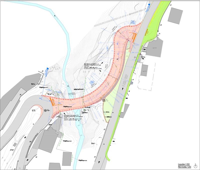 Die neue Umfahrungsstraße samt Stahlbetonplatte mit Stützmauern, Tragstrukturen und Widerlager wird ungefähr 125 Meter lang und verbindet die schon bestehende Kehre auf der LS 29 mit der Kreuzung der LS 146 „St. Andrä – St. Leonhard“ bzw. LS 63 „Guggenbichl“. Laut technischem Bericht wird auch die Trasse so weit wie möglich Richtung Berg hingeschoben, um die notwendigen Kunstbauten im Abschnitt zu verringern. Für Fußgänger ist ein Gehweg vorgesehen.